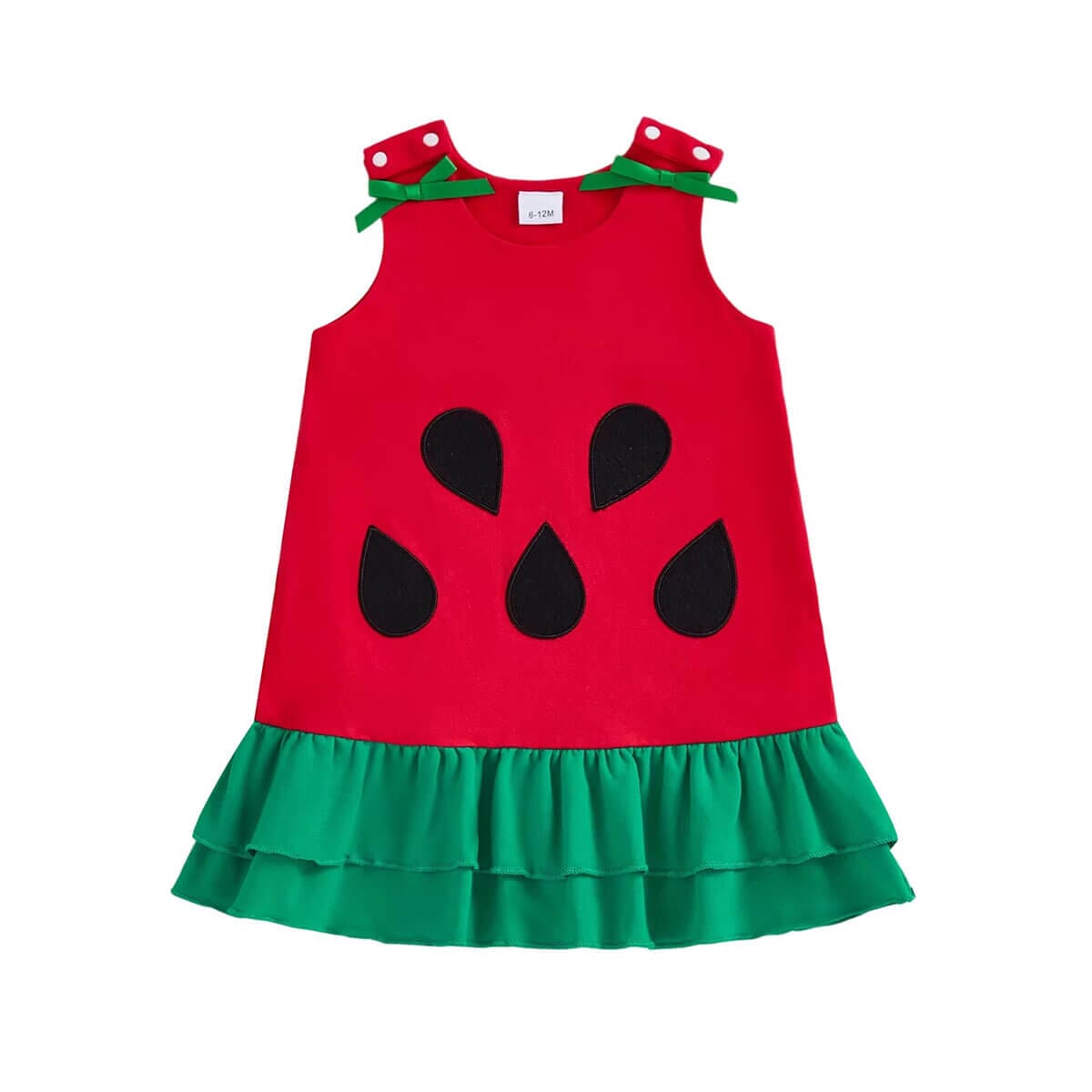 This adorable toddler dress brings sweet summer vibes with its fun watermelon-inspired design. The bright red bodice features playful “seed” appliqués that make the look instantly eye-catching. Green ruffle layers at the hem add a charming touch and give the dress a flouncy, twirl-worthy finish. Shoulder bows and snap details ensure easy dressing and extra cuteness. Perfect for warm days, parties, or photos, this dress is sure to make her stand out with fruity charm.