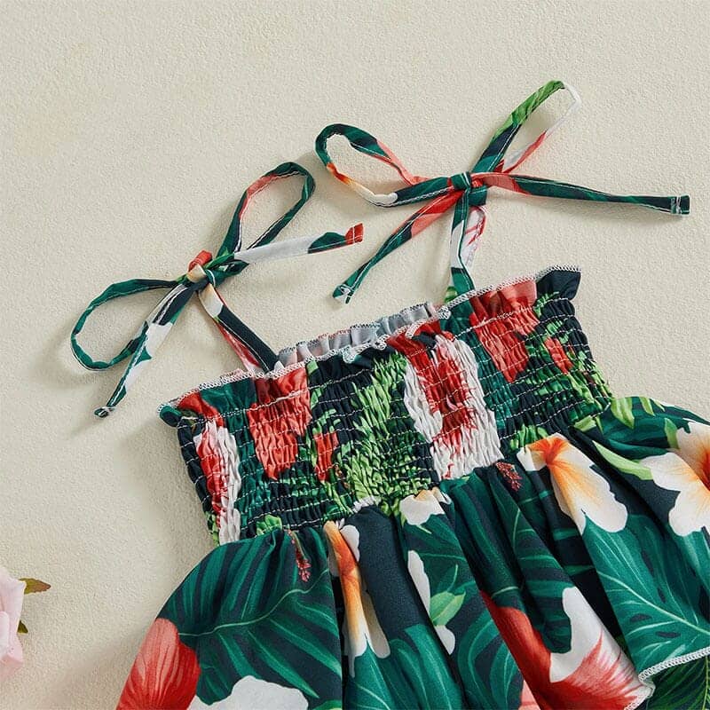 This vibrant toddler girl's jumpsuit is a perfect choice for summer adventures, featuring a lively tropical print in two appealing color schemes. The jumpsuit boasts a comfortable smocked bodice with sweet peplum detailing, creating a charming silhouette. Adjustable tie-shoulder straps ensure a customizable fit, and the wide-leg pants provide ample room for play and movement. This stylish and comfortable jumpsuit is ideal for adding a splash of fun to your little one's wardrobe.