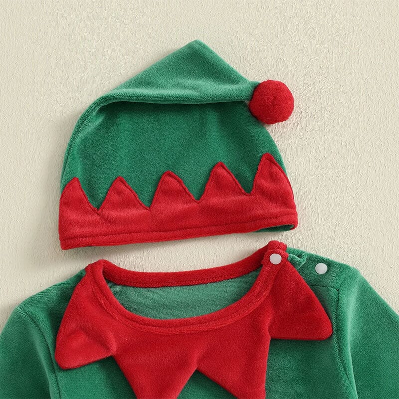 Turn your little one into Santa’s cutest helper with this adorable elf costume! The green jumpsuit features playful red cuffs, a festive collar, and a black “belt” design for that classic elf look. Soft yellow star appliqués and snap closures make it as practical as it is charming. The matching elf hat with a red pom-pom adds the perfect finishing touch. Ideal for Christmas parties, family photos, or cozy holiday mornings — it’s the ultimate outfit for spreading cheer!
