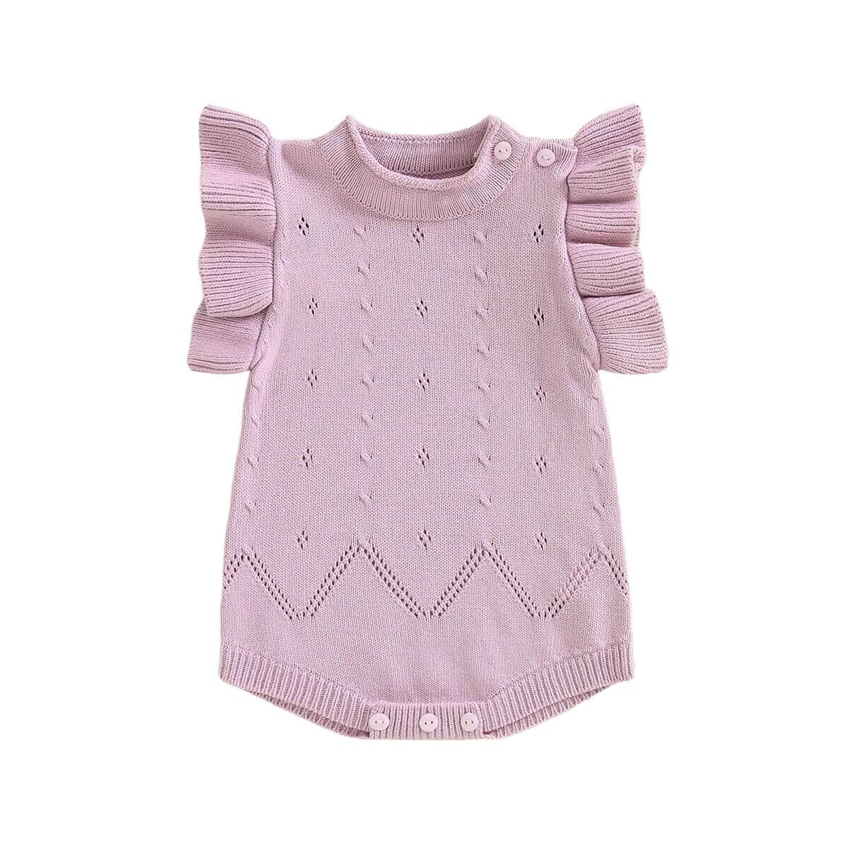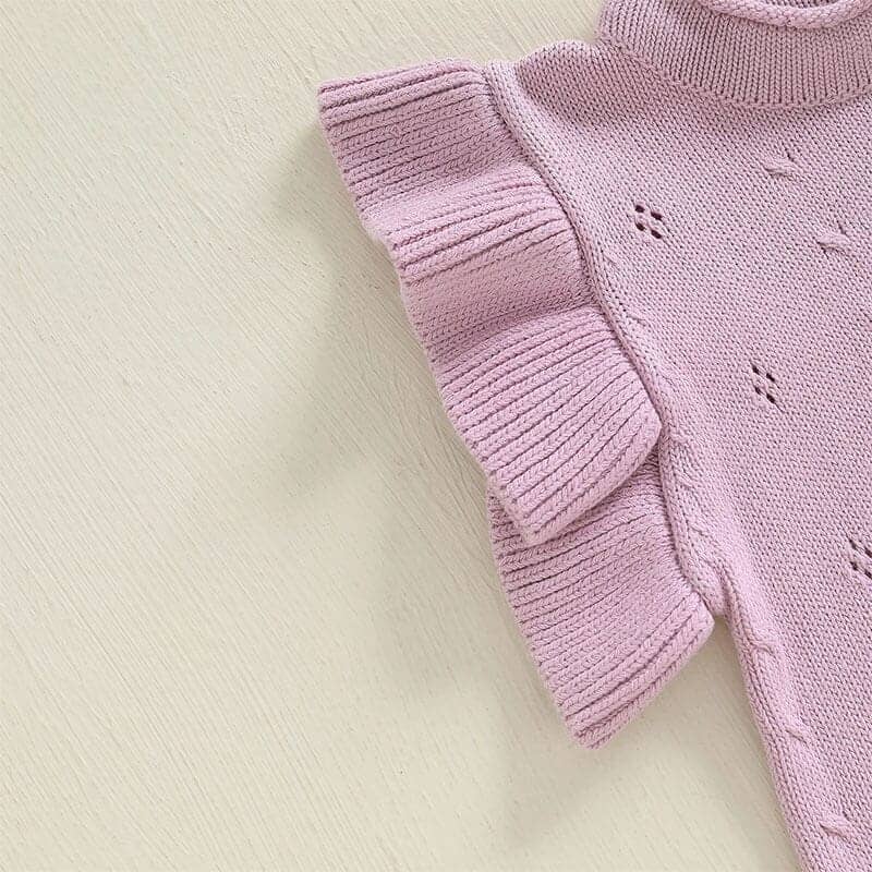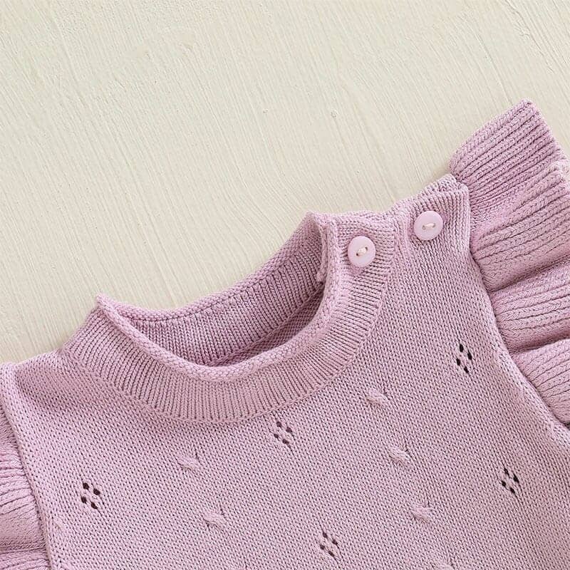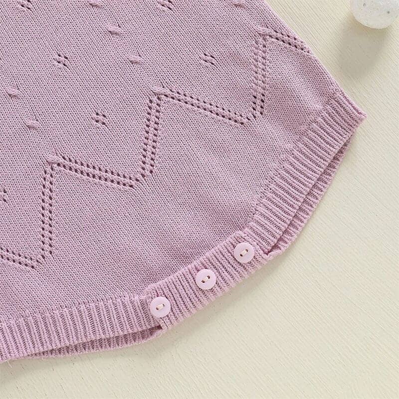 This charming baby girl romper is crafted from soft knit fabric for a cozy yet breathable feel. Designed in a sweet pastel pink, it features delicate pointelle detailing and a zigzag knit pattern for added elegance. The ruffled sleeves add a playful and feminine touch. Convenient shoulder buttons and bottom snaps make dressing and diaper changes quick and easy. Perfect for special occasions or everyday wear, this romper combines comfort and style effortlessly.