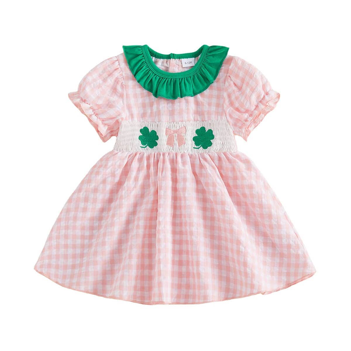 Sweet and festive, this toddler girl dress is a charming choice for St. Patrick’s Day celebrations. Designed in a soft pink gingham pattern, it features a smocked waist with adorable embroidered shamrocks and a delicate bow detail for a lucky touch. The ruffled green neckline adds a playful pop of color, while the lightweight fabric and puff sleeves keep her comfortable all day long. Perfect for holiday parties, family gatherings, or festive photos, this dress blends classic style with St. Patrick’s Day charm.