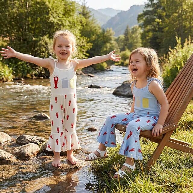 This adorable toddler girl jumpsuit is made from a soft ribbed fabric that feels comfortable and breathable for everyday wear. It features cute lobster prints throughout, a playful embroidered design on the front, and adjustable tie straps for a flexible, comfy fit. The flared leg detail adds a fun, stylish touch while allowing easy movement for little ones. Perfect for warm days, vacations, or casual outings, this jumpsuit is both practical and eye-catching.
