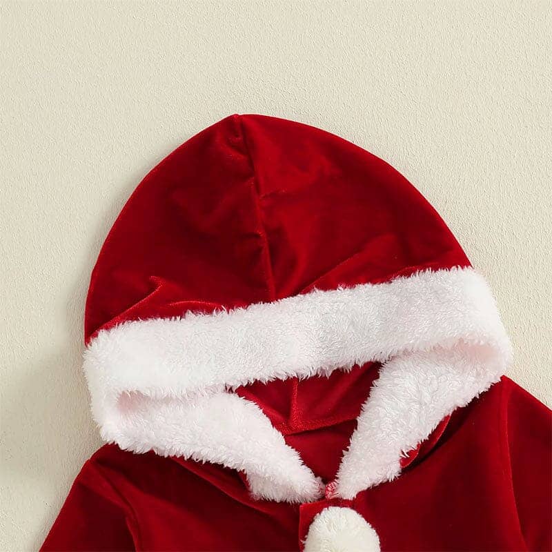 Get your little one ready for festive fun with this adorable Santa Baby Christmas Jumpsuit! Designed to look just like Santa’s classic outfit, it features soft red velvet fabric with white faux fur trim, fuzzy pom-pom buttons, and a golden belt accent for the perfect holiday charm. The cozy hood keeps your baby warm and picture-ready during chilly winter days. Perfect for Christmas photos, family gatherings, or cozy holiday mornings by the tree!