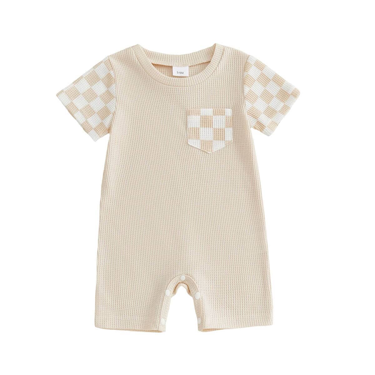 Keep your little one comfy and stylish in this adorable waffle knit baby romper, available in 6 charming colors. Designed with a soft, breathable fabric, it’s perfect for everyday wear during warmer days. The contrasting checkered sleeves and matching chest pocket add a playful, modern touch to this classic piece. Snap closures at the bottom make diaper changes quick and easy, while the relaxed fit ensures all-day comfort for active babies.