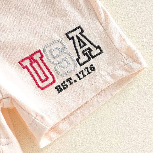 Celebrate in style with this adorable toddler boy USA set, perfect for the 4th of July and all summer festivities. The soft blue tee features a bold “USA Est. 1776” design for a classic patriotic look. Paired with comfy drawstring shorts, this outfit offers an easy, flexible fit for active little ones. Perfect for parades, family BBQs, and everyday wear, this set is a must-have for your little patriot.