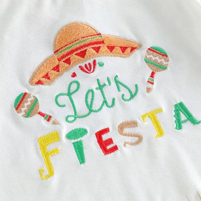 This adorable baby girl set is perfect for bright and cheerful days. It features a soft short-sleeve top with a fun “Let’s Fiesta” print and playful fringe detail for an extra touch of style. The matching striped bloomers offer a comfortable fit with an elastic waistband, making it easy for your little one to move and play. A colorful bow headband completes the look, adding a cute and coordinated finish. Ideal for parties, outings, or everyday wear, this set brings fun and comfort together effortlessly.