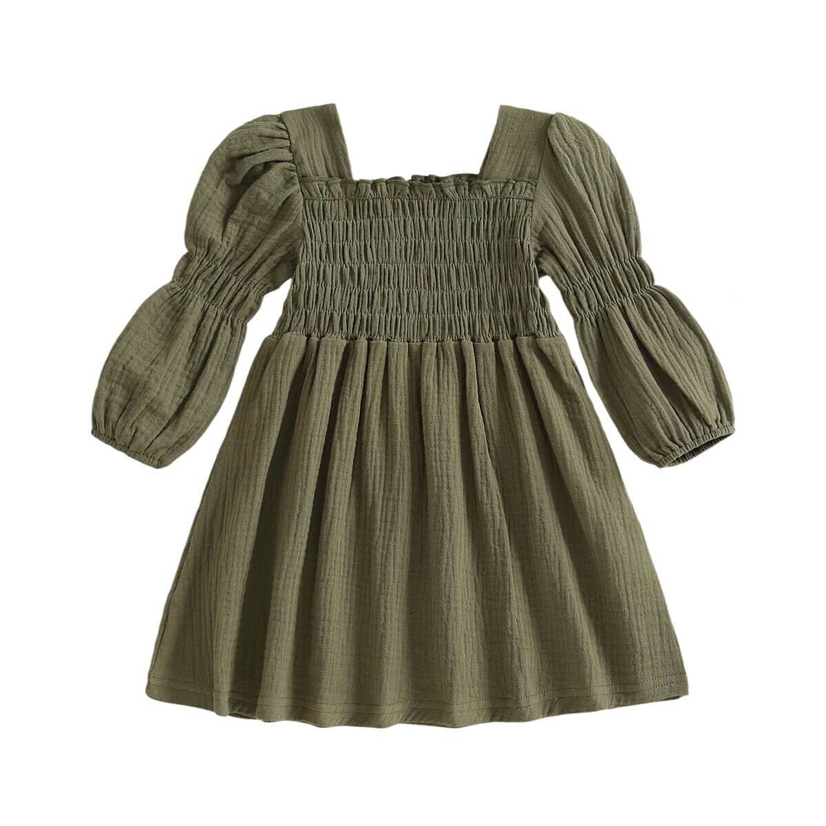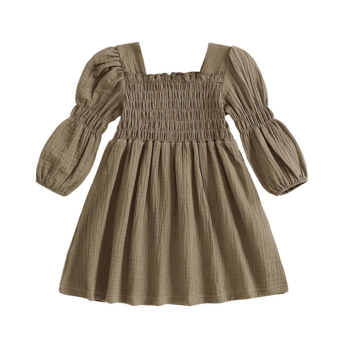 This charming long-sleeve dress is a perfect staple for your little girl's wardrobe. Designed with a stretchy smocked bodice and playful puff sleeves, it combines comfort with a touch of elegance. The flowy skirt gives it a sweet and twirl-worthy finish, ideal for playdates or special occasions. Easy to dress up or down, it’s a must-have piece for year-round wear.