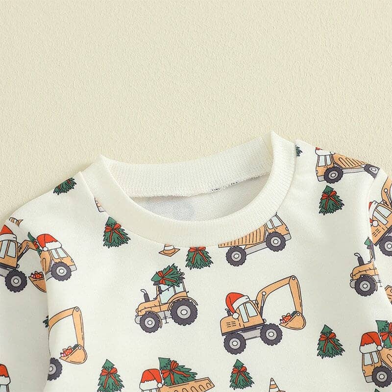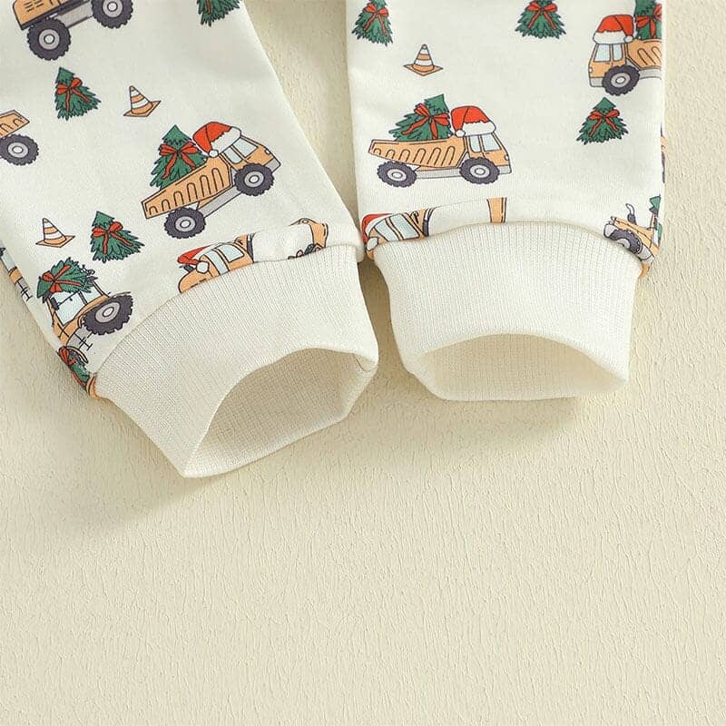 This festive little boy set is full of holiday cheer, making it a must-have for the Christmas season. The cream-colored sweatshirt and matching jogger pants are decorated with playful holiday truck and tree prints, bringing a fun and cozy vibe. Made from soft, breathable fabric, this set keeps your little one comfortable whether playing, napping, or celebrating with family. Perfect for Christmas morning photos, holiday gatherings, or cozy days at home, this outfit is both festive and practical.