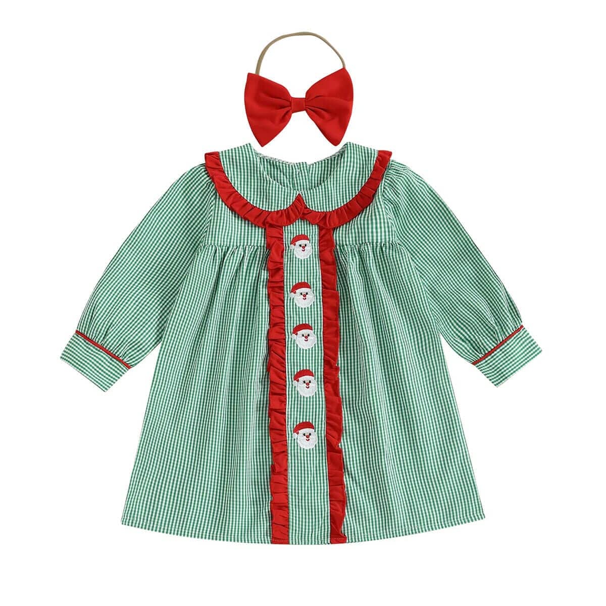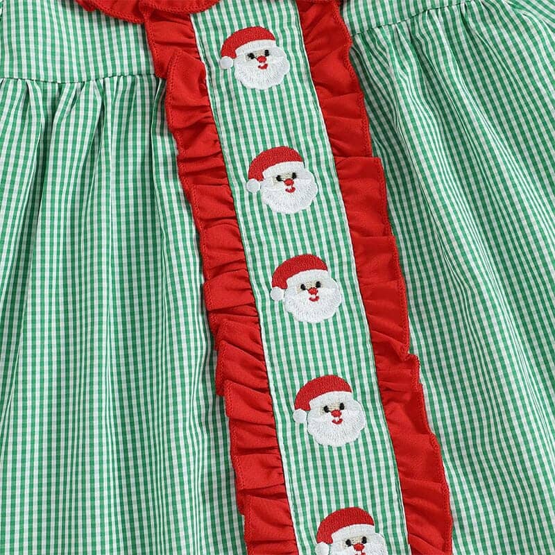 This festive toddler girl dress is the perfect choice for the holiday season. Designed in a charming green gingham pattern, it features adorable embroidered Santa faces down the front, framed with bright red ruffles for a cheerful pop of color. The classic Peter Pan collar and long sleeves add a timeless touch, making it ideal for family gatherings, Christmas parties, or holiday photos.