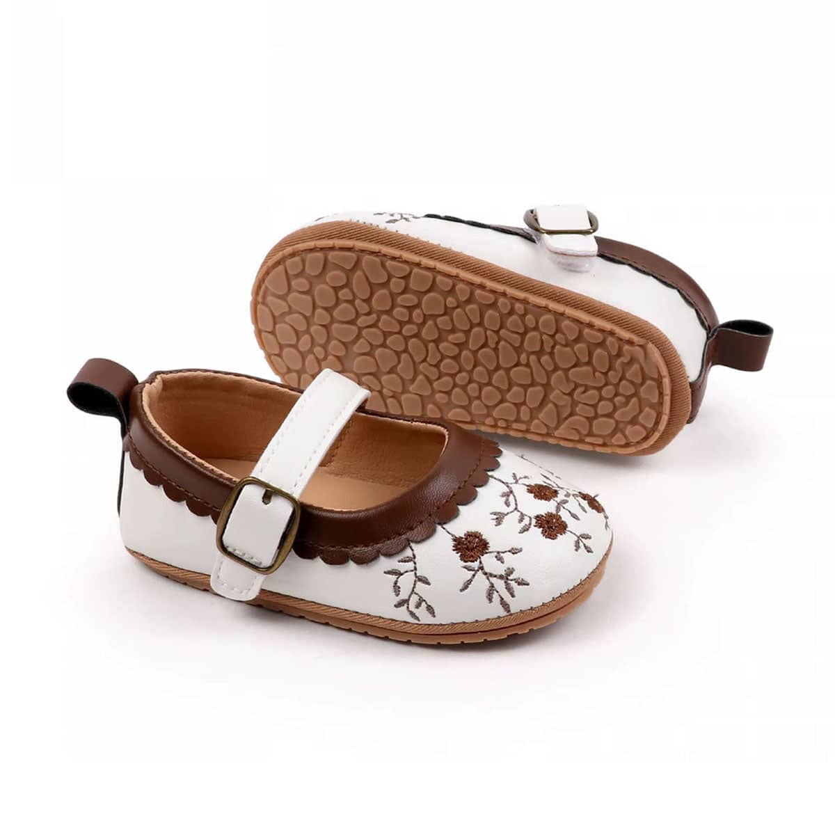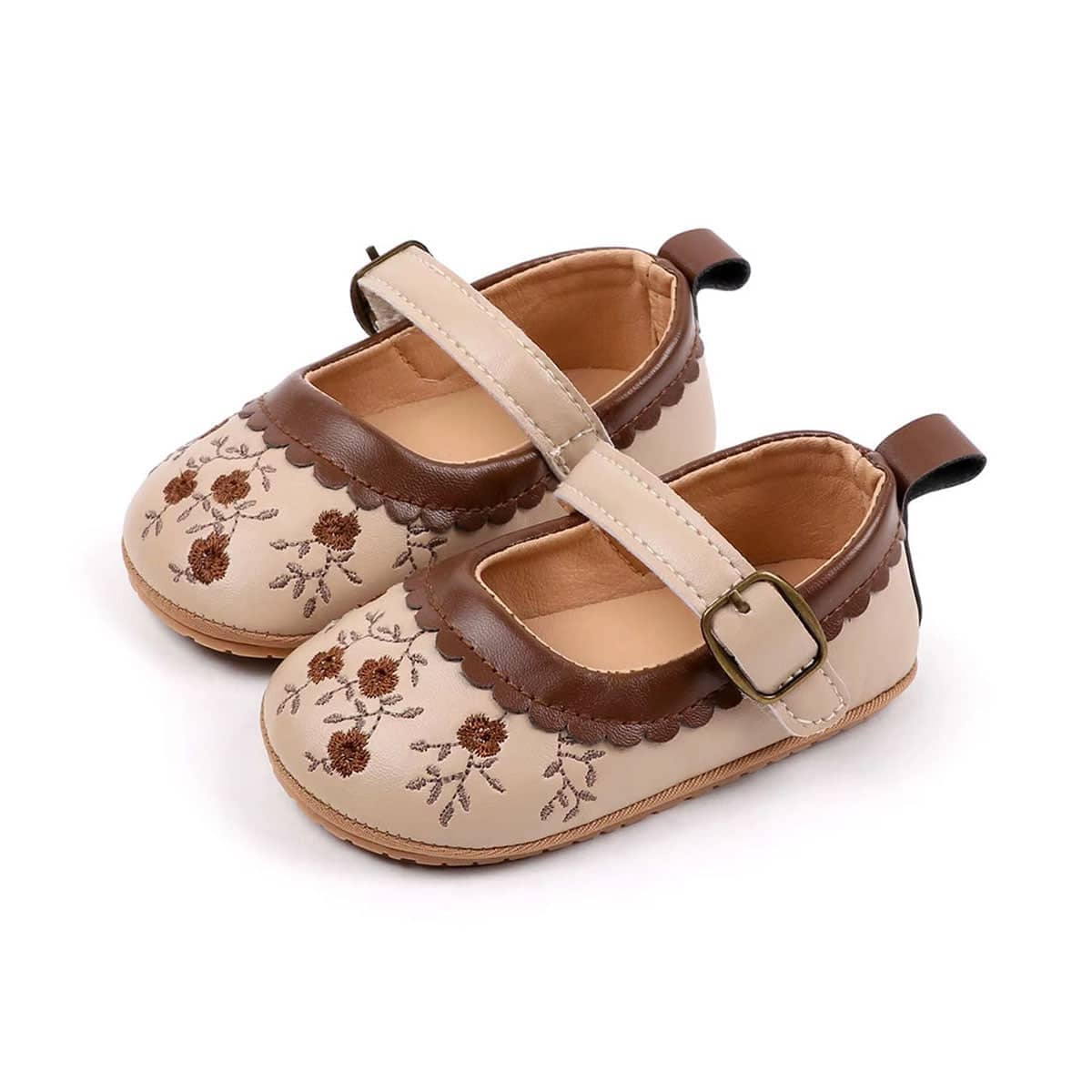 These adorable baby girl shoes combine classic style with everyday comfort. Designed with delicate floral embroidery and a charming scalloped trim, they add a sweet touch to any outfit. The adjustable strap with a buckle closure ensures a secure and comfortable fit for your little one’s tiny feet. Soft inner lining and flexible soles provide gentle support, making them perfect for early walkers or special occasions.
