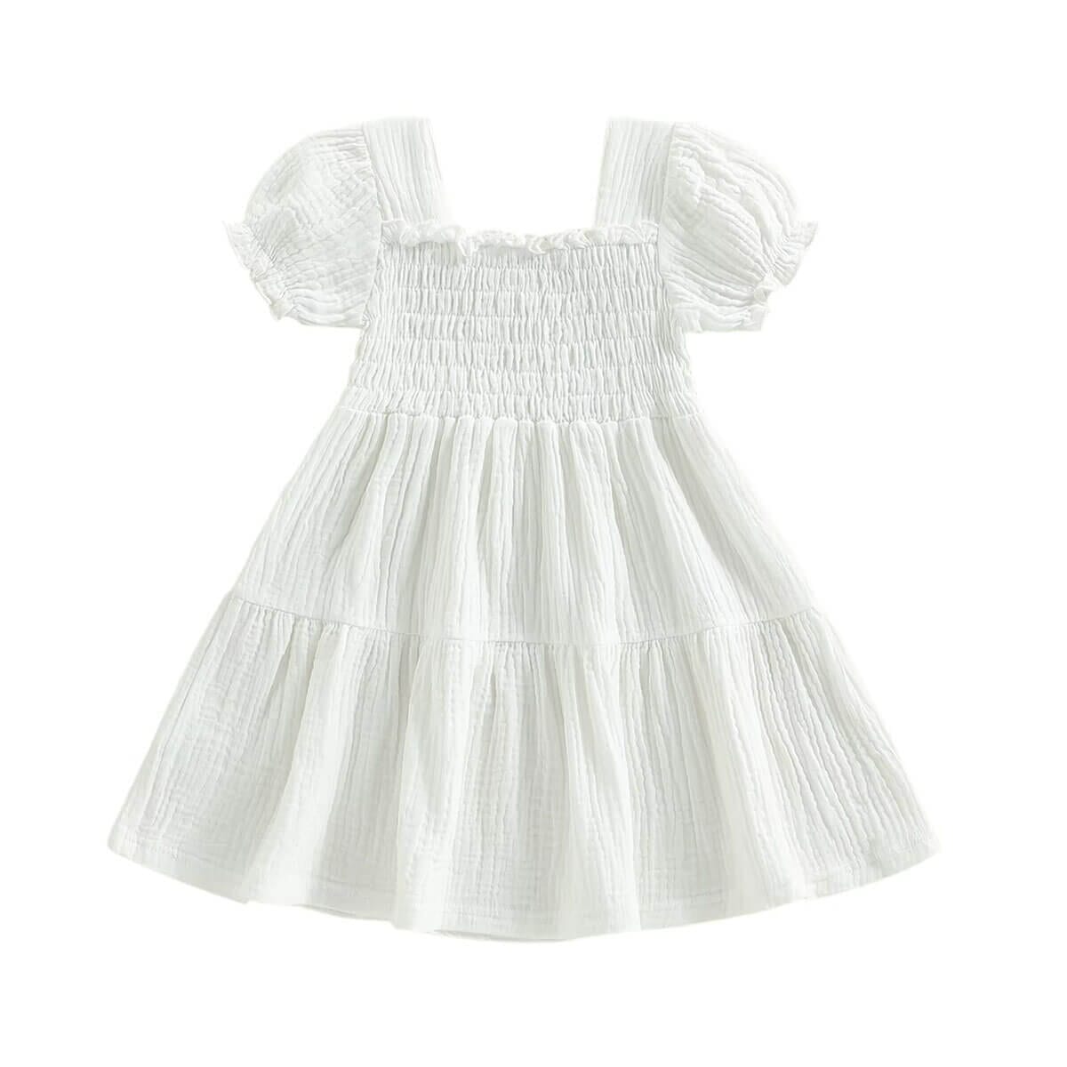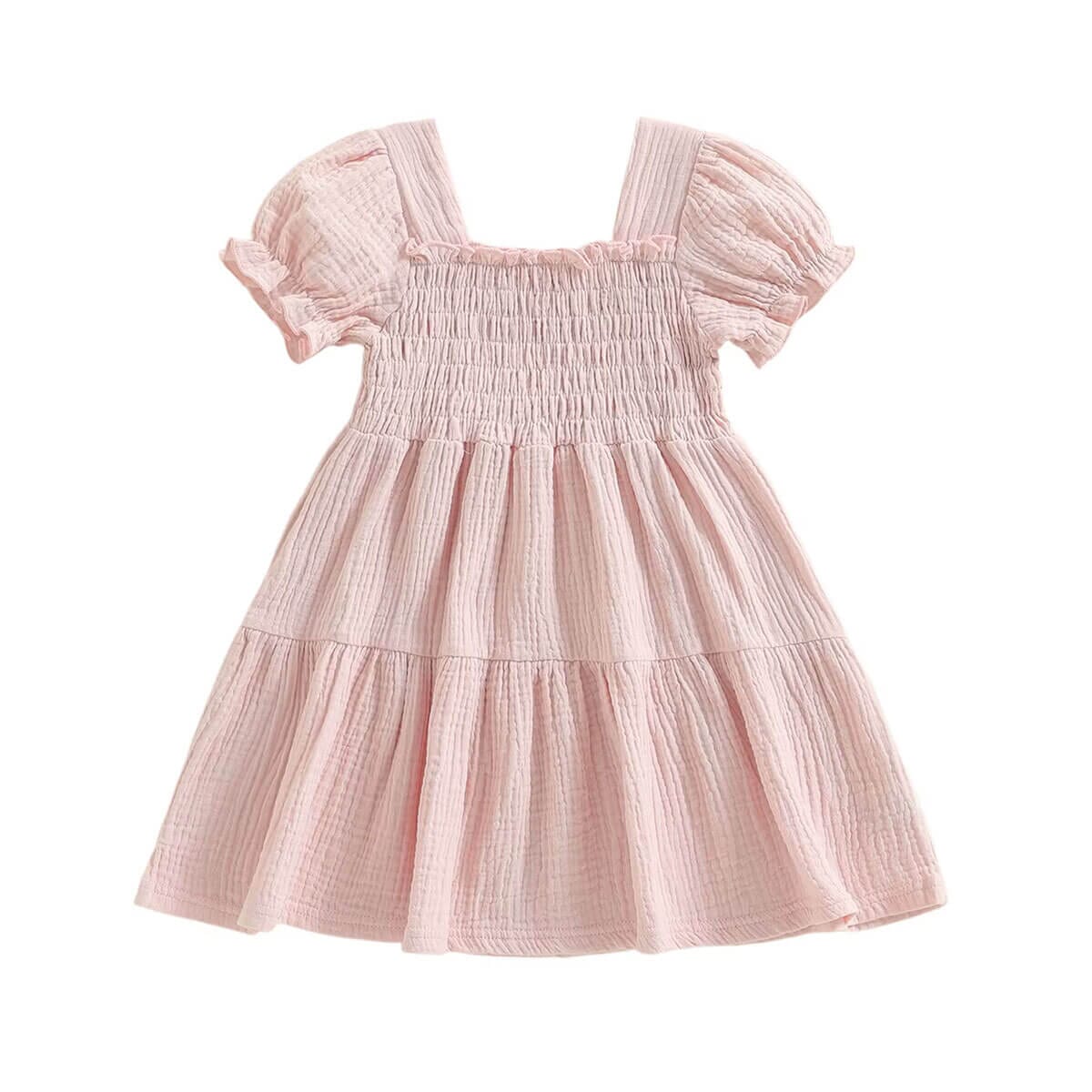 This adorable toddler girl dress is designed with a smocked bodice and puff sleeves for the perfect blend of comfort and charm. The tiered skirt adds a lovely flowy silhouette that’s perfect for twirling. Wide straps and elastic details ensure an easy, comfortable fit for everyday wear or special outings. Available in three beautiful colors, this dress is a must-have staple for warm-weather style.