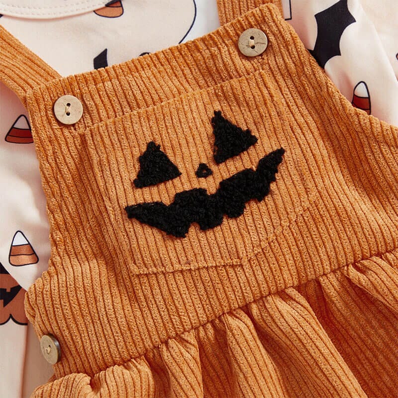 This adorable baby girl set is the perfect outfit for celebrating Halloween in style. It features a long-sleeve romper with playful ghost, pumpkin, bat, and candy corn prints that bring festive charm. The set also includes an orange corduroy suspender dress with a cute embroidered jack-o’-lantern face on the front. A matching bow headband completes the look, making it both fun and picture-ready.