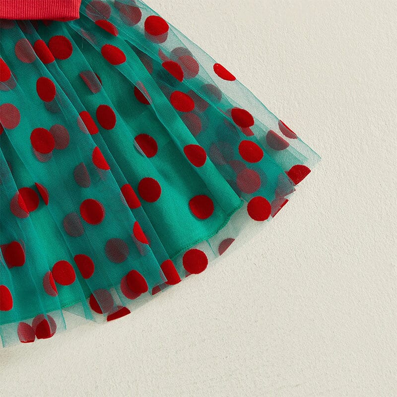 This festive toddler girl set is the perfect outfit for celebrating Christmas in style! The red sweatshirt features a cheerful Christmas tree print with presents and snowflakes, bringing instant holiday joy. Puffy tulle sleeves add a touch of elegance, making it ideal for parties and family photos. The matching green skirt with red polka dots and a tulle overlay creates a fun and festive look. Soft, cozy, and full of Christmas spirit — your little one will shine bright all season long!