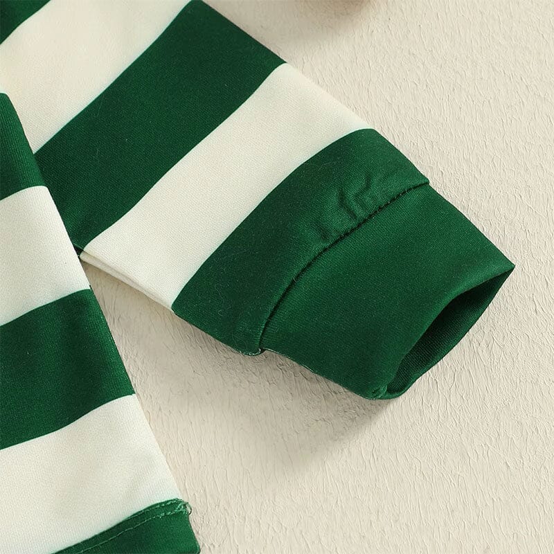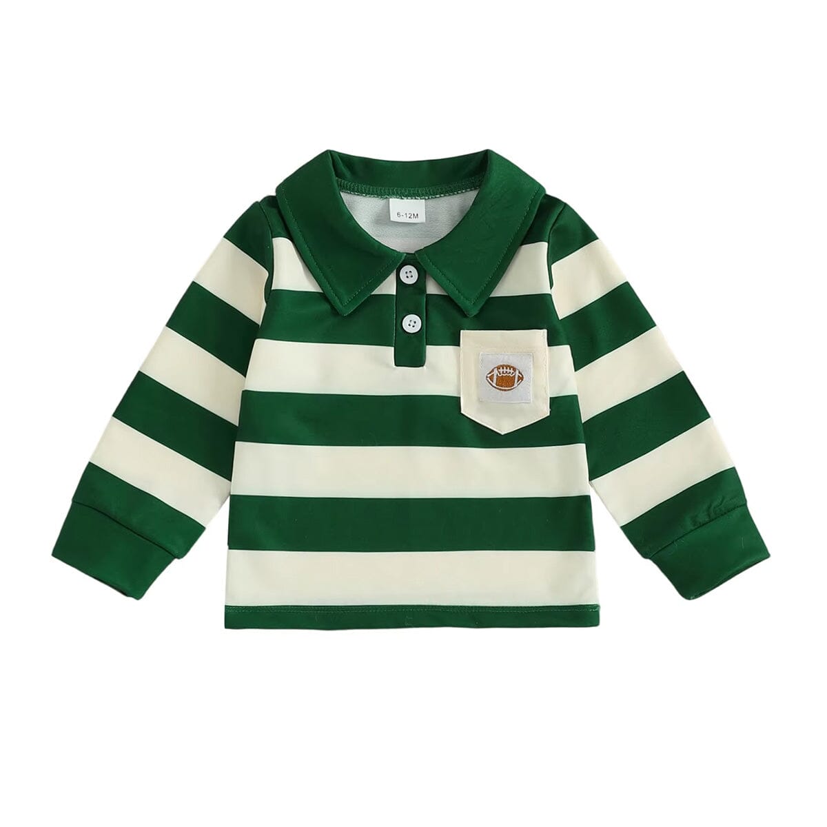 This toddler boy pullover is a stylish and sporty choice for everyday wear. Featuring bold green and white stripes, it adds a playful touch to your little one’s wardrobe. The collared neckline with button details gives it a polished look, while the small pocket with a football patch adds extra charm. Perfect for casual outings, family gatherings, or layering on cooler days, this pullover is both practical and fashionable.