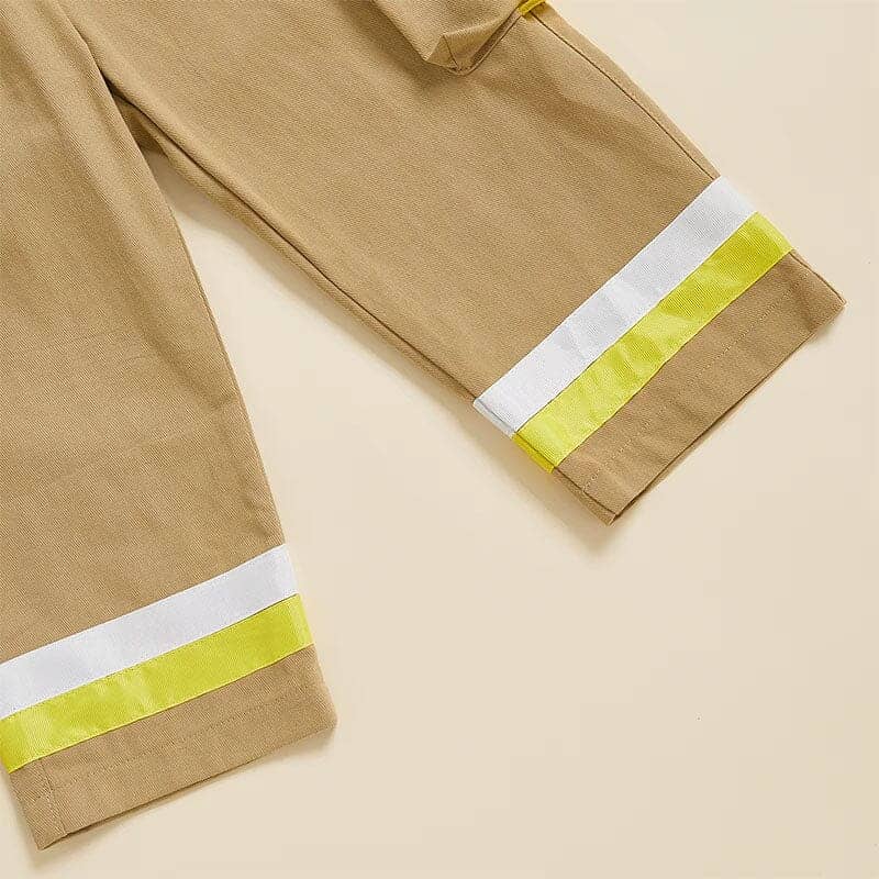 This adorable unisex toddler set is perfect for little ones who dream of being everyday heroes. The navy blue T-shirt features a fire department print, giving it an authentic and playful firefighter look. Paired with khaki cargo pants that include reflective stripes and bright red suspenders, the outfit is both fun and realistic. Ideal for themed parties, pretend play, or casual outings, this set lets your toddler show off their brave firefighter spirit in style.