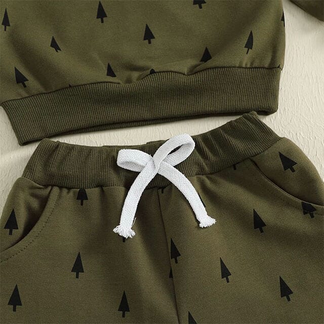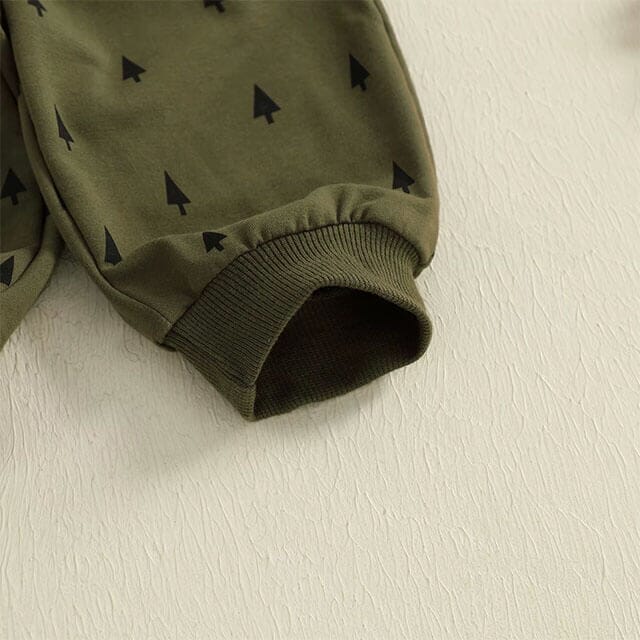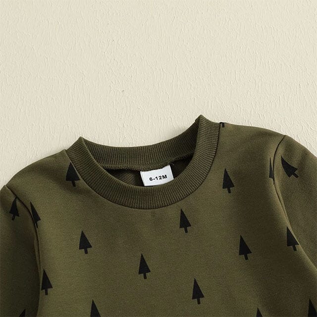 This cozy toddler boy set is the perfect mix of comfort and festive charm. Made from soft, breathable fabric, it features a long-sleeve sweatshirt and matching jogger pants with an adorable all-over pine tree print. The classic olive-green color makes it a stylish choice for everyday wear or holiday gatherings. Ideal for Christmas photos or winter adventures, this set brings a touch of holiday spirit to your little one’s wardrobe.