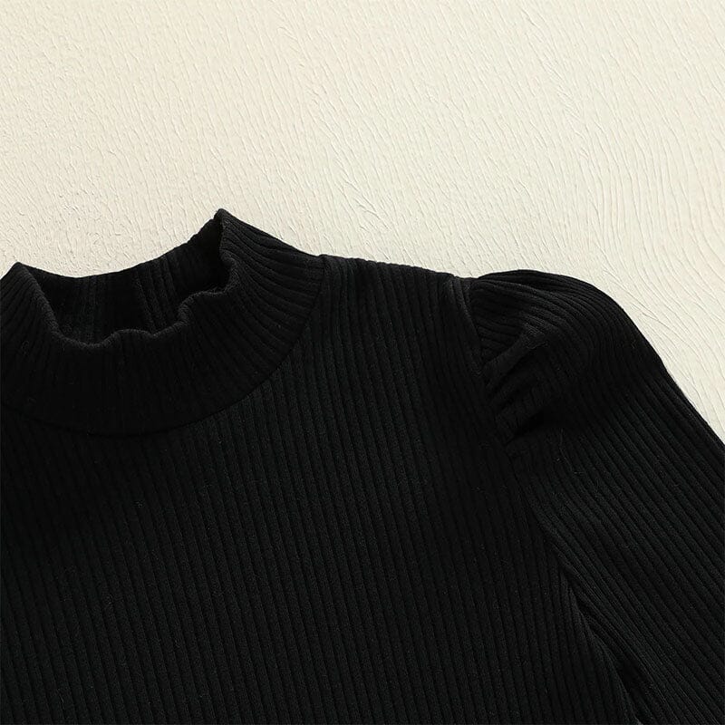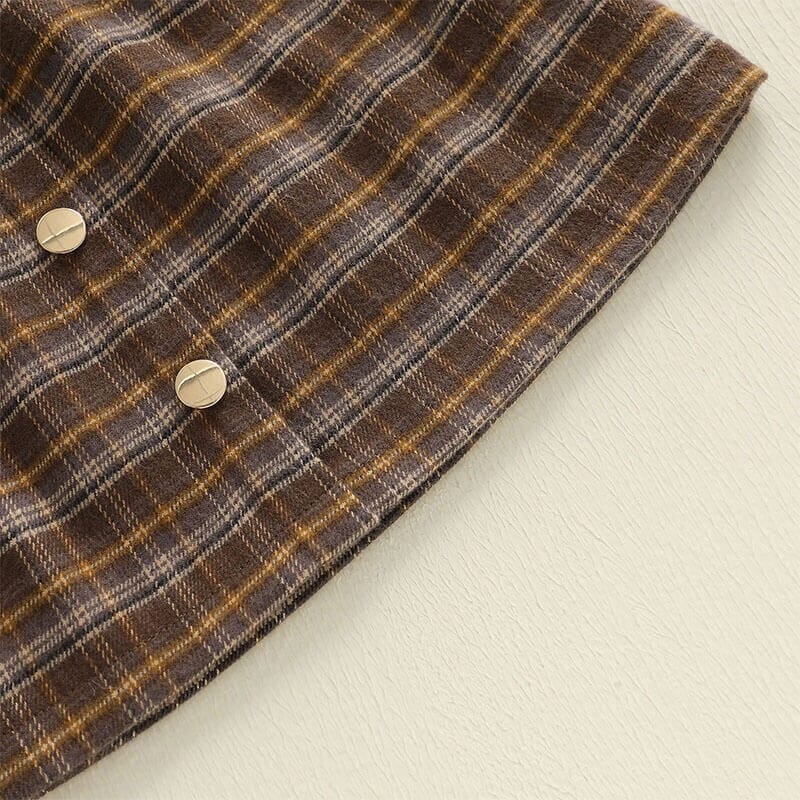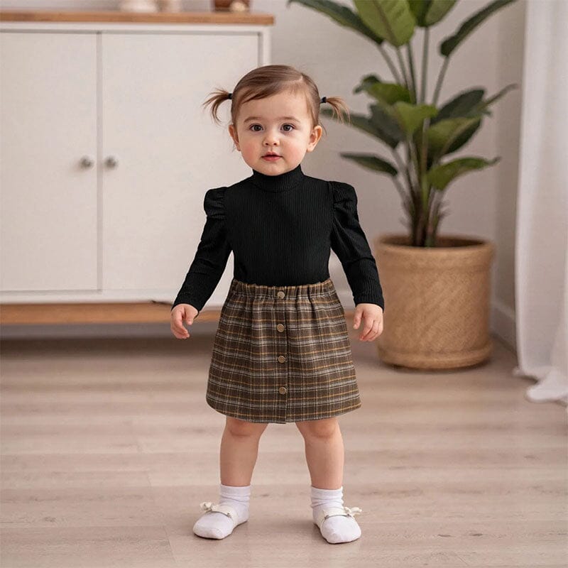This stylish toddler girl set brings a touch of classic charm to your little one’s wardrobe. It features a soft ribbed black top with long sleeves and a sweet ruffled mock neck, perfect for cooler days. The matching brown plaid skirt with button accents adds a trendy, preppy vibe. Dress it up with tights and boots for an effortlessly adorable fall or winter look!