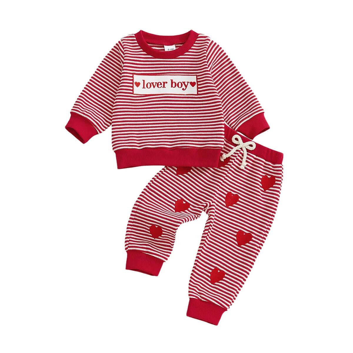 This little boy set includes a long-sleeve striped sweatshirt and matching pants, making it a fun and festive choice for Valentine’s Day. The sweatshirt features a ribbed neckline, cuffs, and hem, with a cute “lover boy” patch on the front. The matching pants have an elastic waistband with a drawstring and ribbed cuffs for a comfortable fit. Designed for everyday comfort, this set is easy to wear and perfect for special Valentine’s Day moments.