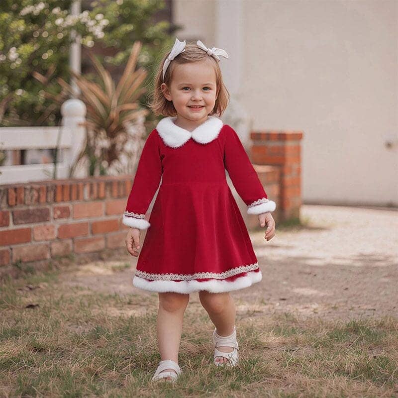 This adorable toddler girl costume is perfect for bringing festive cheer to Christmas celebrations! Designed in a classic Santa style, it features a bright red velvet dress with soft white faux fur trim on the collar, cuffs, and hem. Delicate lace detailing adds a sweet, elegant touch. The matching Santa hat completes the merry holiday look. Ideal for Christmas parties, family photos, or festive events, this outfit will make your little one the star of the season!