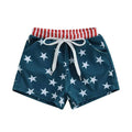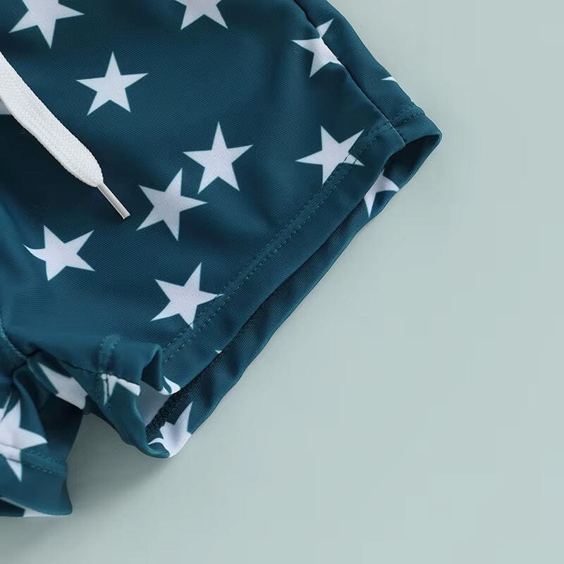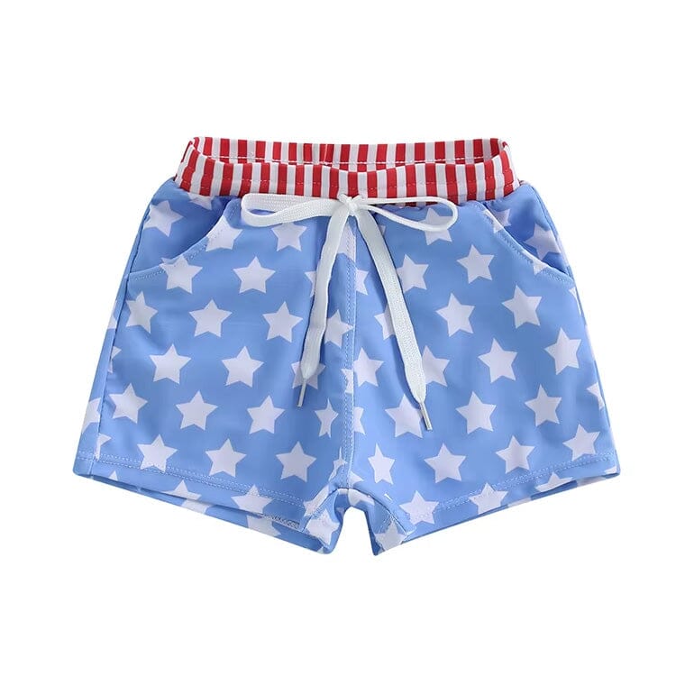 Get your little one ready for star-spangled summer fun with these patriotic toddler boy beach shorts. Featuring a bold star print and a red-and-white striped waistband, they’re perfect for celebrating the 4th of July in style. Available in two fun color options—light blue and navy—these shorts are made for comfort and play. Ideal for beach days, backyard BBQs, or festive parades!