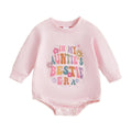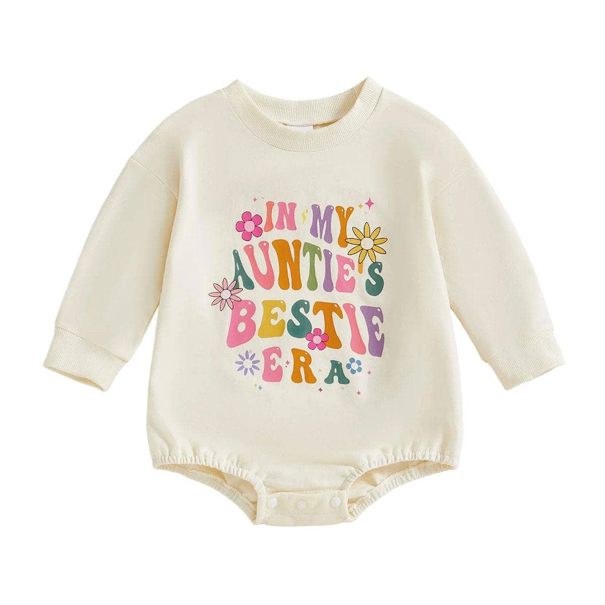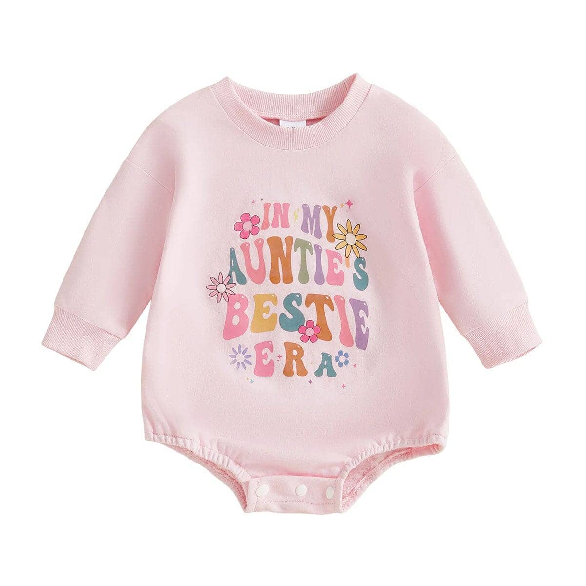 This adorable baby girl bodysuit is a fun and cozy pick for your little one’s wardrobe. Featuring a playful “In My Auntie’s Bestie Era” graphic with bright, colorful letters and flowers, it’s full of personality and charm. Made from soft, breathable fabric with long sleeves and snap closures for easy changing. Available in two sweet pastel shades—pink and cream—perfect for gifting or showing off that special auntie bond.