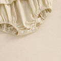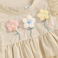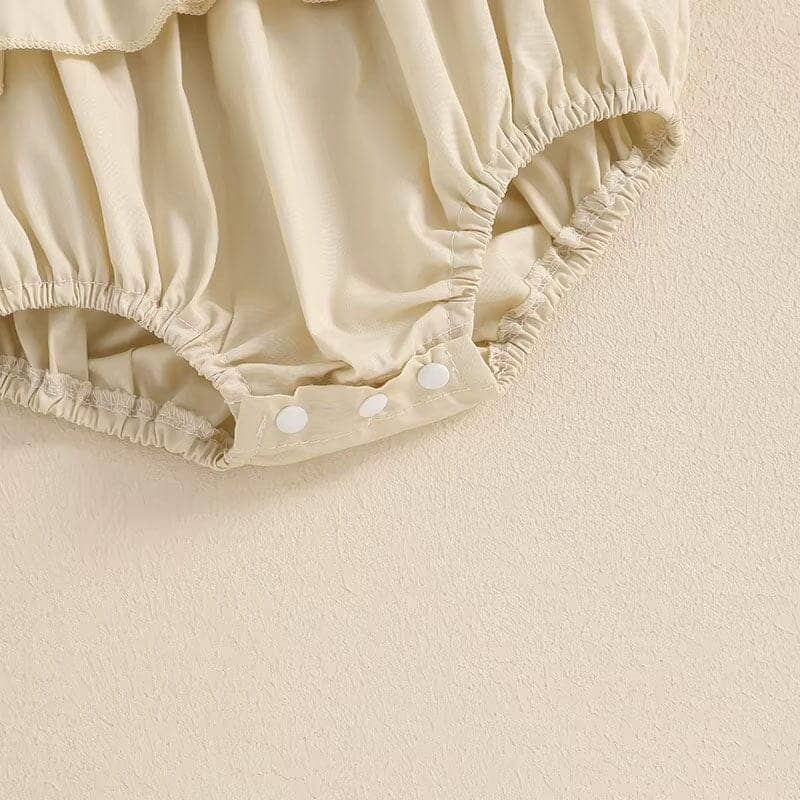 This baby girl romper is a charming and delicate outfit perfect for any special occasion. The soft beige fabric is adorned with adorable embroidered pastel flowers, adding a sweet touch of nature-inspired beauty. Featuring flutter sleeves and a double-layered ruffle design, this romper offers a stylish yet comfortable fit for your little one. The snap closure at the bottom ensures easy diaper changes, while the matching bow headband completes the look with extra cuteness. Whether for a family gathering, a photoshoot, or everyday wear, this romper is a must-have for your baby's wardrobe.