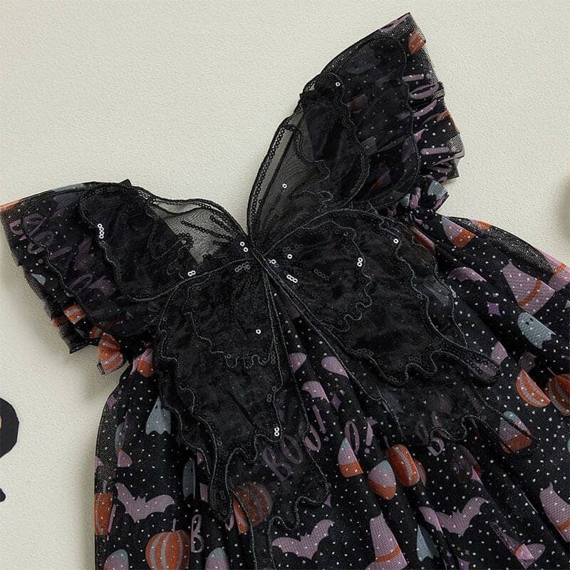 This adorable baby girl dress is the perfect outfit for Halloween celebrations. Designed with a playful black tulle overlay, it features festive prints of pumpkins, ghosts, bats, candy corn, and the word “BOO!” for a fun seasonal touch. The ruffled straps add a charming detail, while the lightweight fabric keeps little ones comfortable. Easy to slip on and off, it’s great for trick-or-treating, Halloween parties, or a cozy photo shoot at home.
