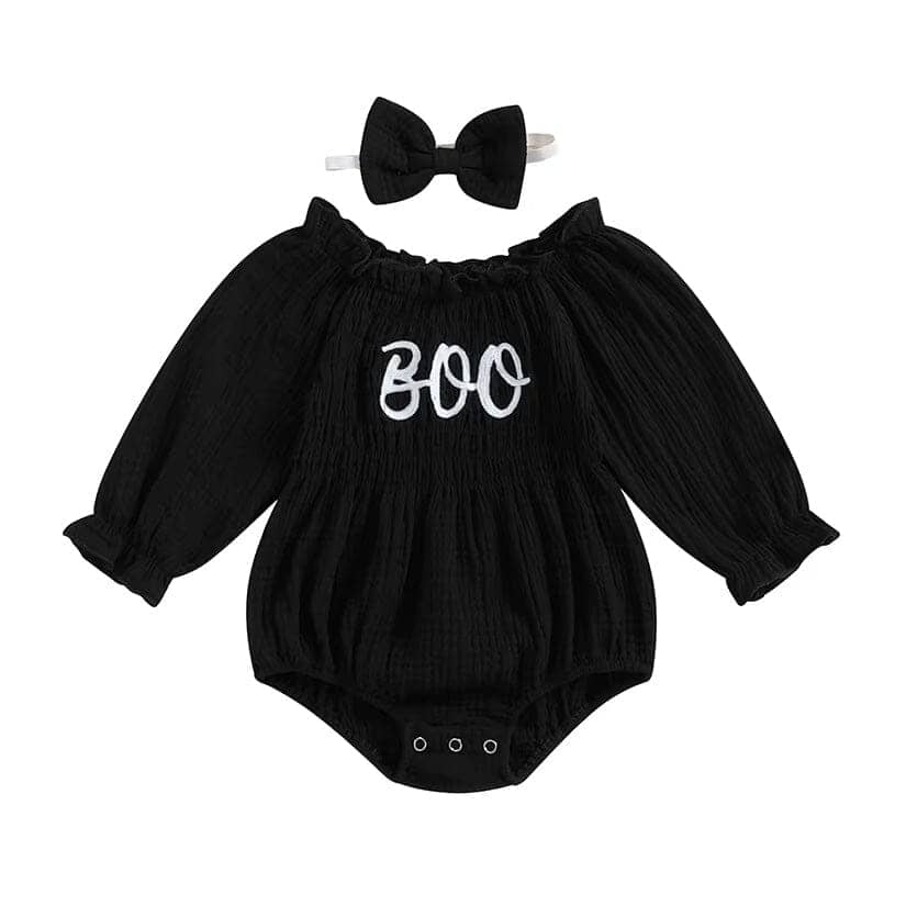 This baby girl romper is the sweetest pick for Halloween fun. Made in classic black with “BOO” embroidered on the front, it adds just the right amount of spooky-cute charm. It also comes with an adorable matching bow headband to complete the festive look. Perfect for Halloween parties, trick-or-treating photos, or simply celebrating the spooky season in style!
