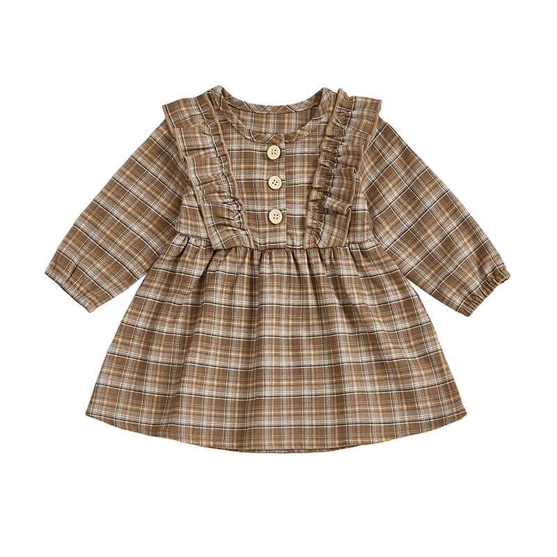 This charming little girl dress features a classic plaid pattern that brings cozy, timeless style to any season. The ruffled front detailing and wooden-style buttons add an adorable touch of vintage elegance. Its soft, breathable fabric and long sleeves keep your little one comfortable for playdates, family outings, or festive gatherings. The gently flared skirt provides plenty of room for movement, making it as practical as it is cute. Perfect for fall, winter, and everyday wear, this dress is a must-have addition to your little girl’s wardrobe.