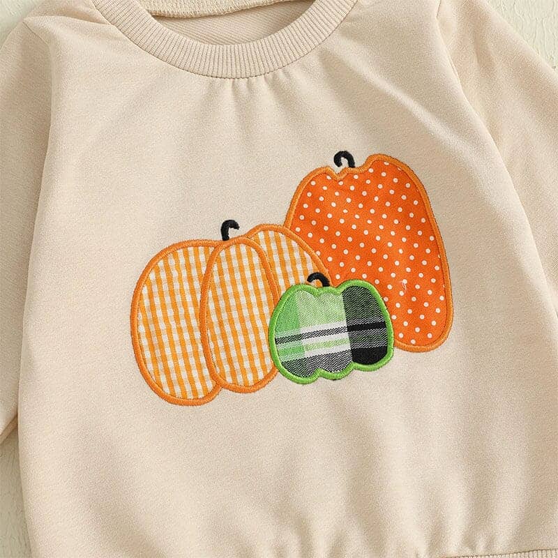 This adorable unisex baby set is the perfect choice for both Halloween and Thanksgiving celebrations. The cream-colored sweatshirt features three playful pumpkin appliqués in orange and green, giving it a festive seasonal touch. Paired with soft, elastic-waist orange pants, the outfit is both cozy and easy for all-day wear. A must-have fall outfit, this set will keep your baby stylish and snug throughout the holiday season.
