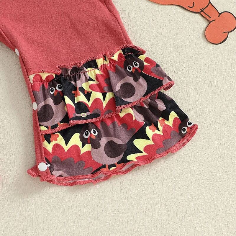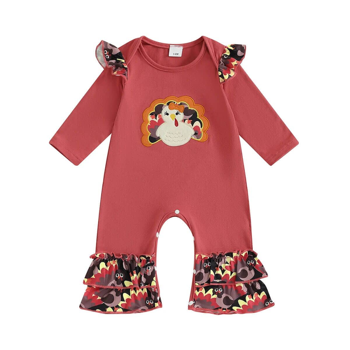 Dress your little one in festive charm with this adorable Thanksgiving jumpsuit. Made in a warm autumn shade, it features a sweet turkey applique at the center that captures the holiday spirit. Ruffle details on the shoulders and pant legs add a playful, girly touch. The soft fabric ensures comfort for all-day wear, while snap closures make diaper changes quick and easy. Perfect for family gatherings, photos, or Thanksgiving dinner, this jumpsuit will make your baby girl the star of the celebration.