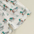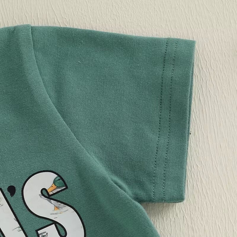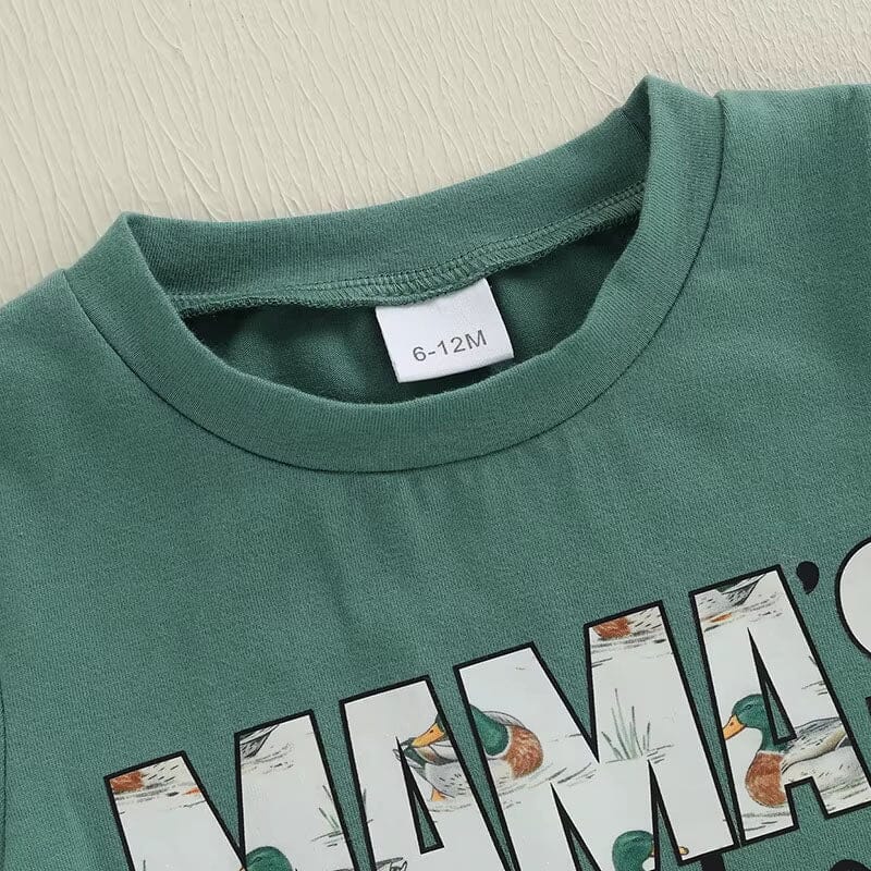 This adorable toddler boy set is perfect for your little "Mama’s Boy" with a wild side. The green tee features bold text filled with charming duck illustrations, adding a playful outdoor vibe. Paired with soft, cream-colored shorts covered in a cute duck print, this outfit is both fun and comfy for everyday adventures. Whether he’s waddling around like a duck or running wild, he’ll do it in style and comfort!