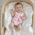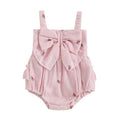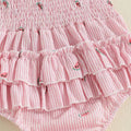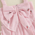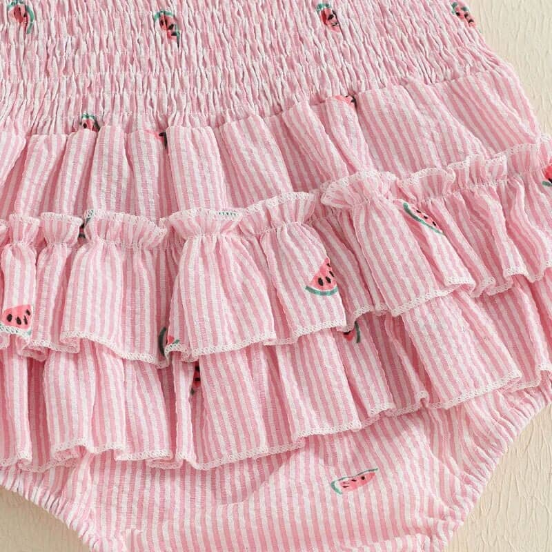 This adorable baby girl romper is the perfect pick for sweet summer days. Made from soft, breathable fabric, it features a pink and white pinstripe pattern with playful watermelon prints throughout. The standout detail is the oversized bow on the front, adding an extra touch of charm and cuteness. Whether for a picnic or a photo shoot, this romper brings fruity fun and stylish flair to your little one’s wardrobe.