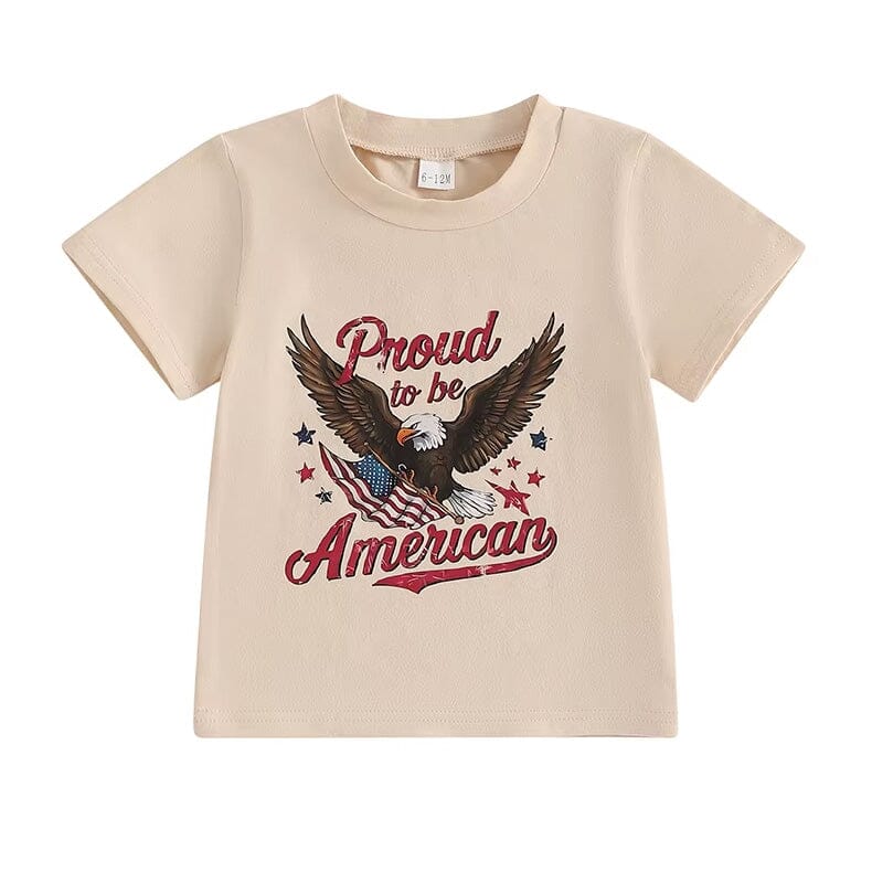 Let your little guy show off his patriotic spirit in this bold “Proud to Be American” tee! Featuring a soaring eagle and waving flag graphic, this shirt is perfect for celebrating the 4th of July or any day of national pride. Its neutral beige color pairs effortlessly with denim, shorts, or festive red, white, and blue. A must-have for little patriots ready to stand tall and proud!