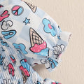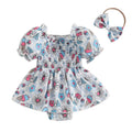 Celebrate the 4th of July in the sweetest style with this adorable baby girl romper! Featuring a charming red, white, and blue print with daisies, peace signs, ice cream cones, and USA lettering, it’s a fun and festive look for Independence Day. The smocked bodice and puff sleeves add a vintage-inspired flair, while the matching bow headband completes the look. Perfect for family barbecues, fireworks, or her first patriotic photo shoot!
