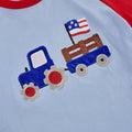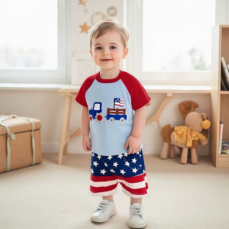 Gear up for festive fun with this patriotic toddler boy set, made just for the 4th of July. The light blue tee features red raglan sleeves and a charming applique of a truck hauling an American flag, adding a playful and spirited touch. The coordinating shorts are decked out in bold stars and stripes, echoing the American flag for a classic holiday look. It’s the perfect pick for your little firecracker to celebrate Independence Day in style!
