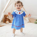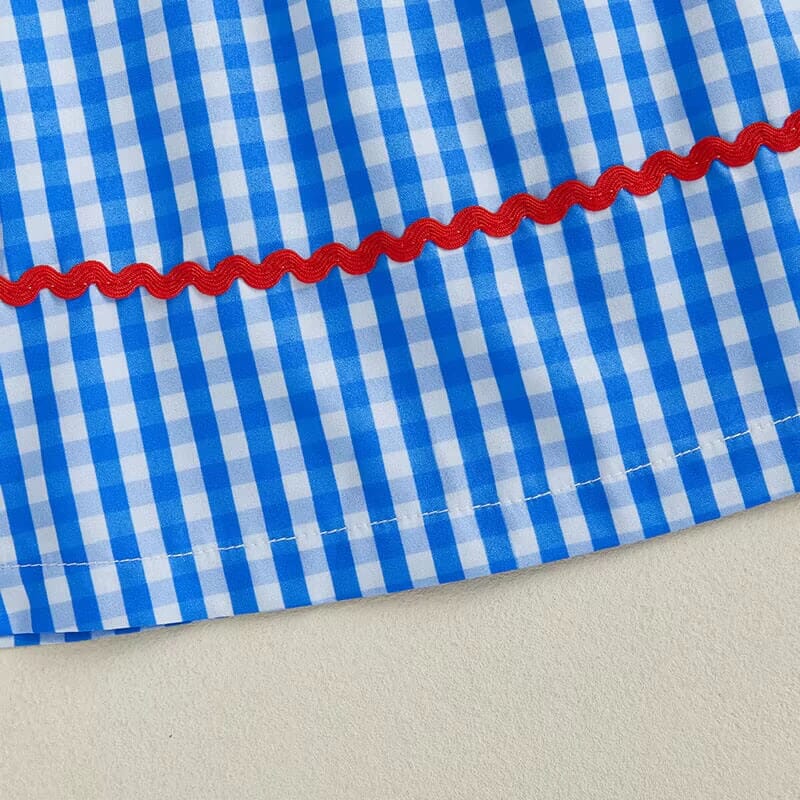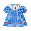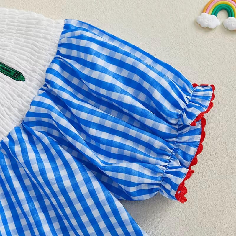 This charming toddler girl dress is perfect for back-to-school moments and classroom celebrations. The classic blue gingham pattern is accented with playful red trim and adorable embroidered school-themed icons like an apple, pencil, scissors, and crayon. Puffy sleeves with red ruffle edges add a touch of sweetness to the vintage-inspired look. The smocked neckline gives it a timeless feel while ensuring comfort all day long.