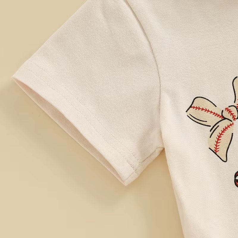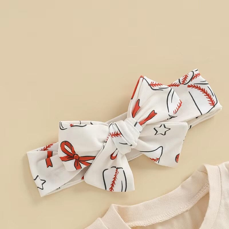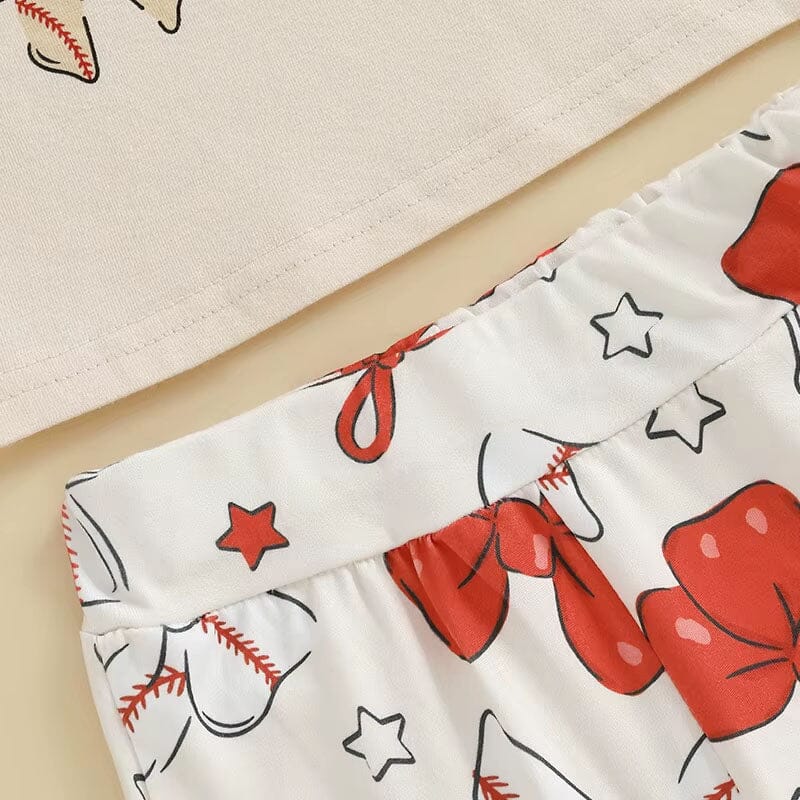 This little girl set is a charming mix of sporty and sweet with its bow-themed design and baseball-inspired details. The soft cream tee features an adorable bow print in fun pops of red and pastel. The matching flared pants are covered in a playful mix of bows and stars, adding flair to every step. A coordinating headband completes the outfit for a picture-perfect look. Whether she's at a family gathering or a game day outing, she'll be comfy and cute all day long.