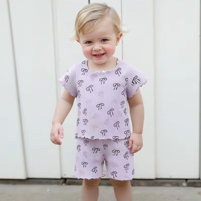 This adorable toddler girl set is the perfect combination of cute and cozy. It features a short-sleeve top and matching shorts, both crafted from a soft ribbed fabric that’s gentle on your little one’s skin. The all-over bow print adds a playful and sweet touch, making it ideal for everyday wear or casual outings. With two lovely color options—lavender and blush pink—there’s a perfect pick for every personality. Lightweight and breathable, this set is a must-have for warm weather days and comfy playtime looks.