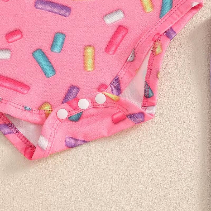 This adorable baby girl set is as sweet as it gets, featuring a vibrant sprinkle-print bodysuit paired with a cupcake-themed overall dress. The pink ruffled bodysuit adds a playful touch, while the lavender dress with adjustable straps ensures a comfortable fit. The cupcake appliqué with colorful details and a cherry on top makes this outfit perfect for birthdays, photoshoots, or any fun occasion.