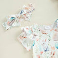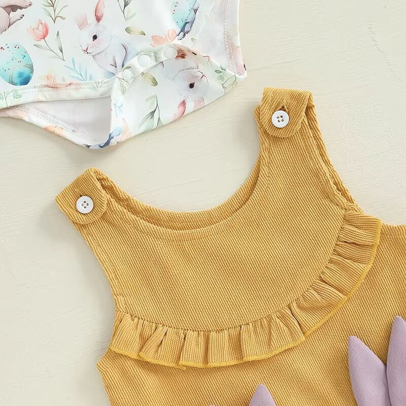 Get your little one ready for Easter with this adorable baby girl set, featuring the sweetest bunny-themed details. The set includes a flutter-sleeve bodysuit with a charming pastel bunny and floral print, perfect for celebrating springtime. Layer it with the mustard-yellow pinafore dress, decorated with cute embroidered bunnies, 3D fabric ears, and fluffy pom-pom tails for an extra playful touch. Completing the look is a matching bow headband, making this outfit picture-perfect for Easter festivities, egg hunts, or family gatherings.