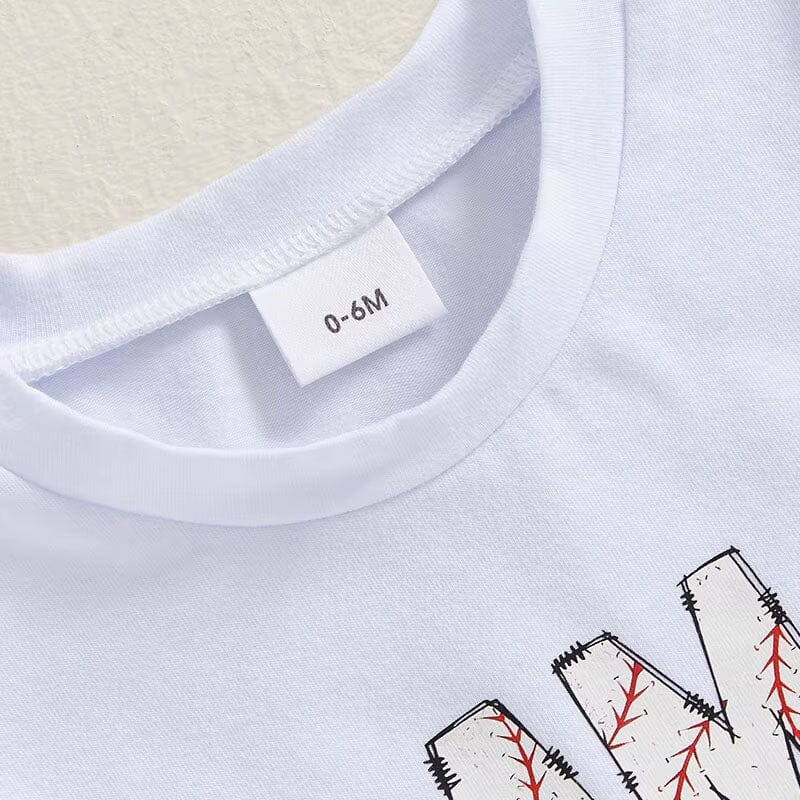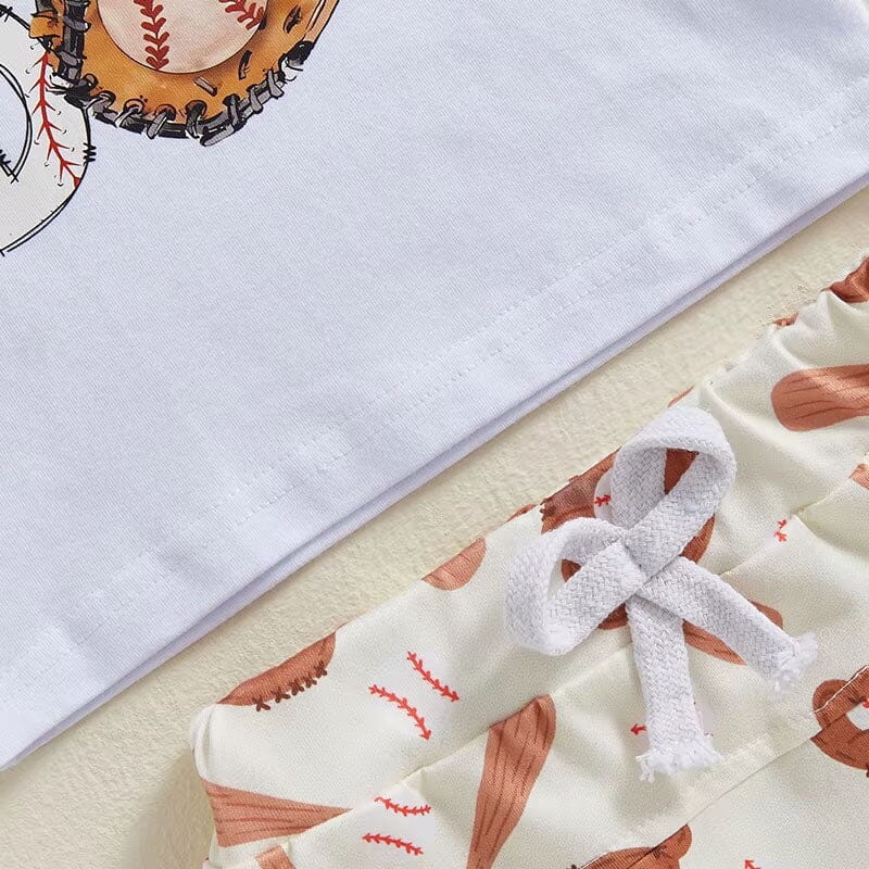Get your little MVP ready for the big day with this adorable toddler boy set! The crisp white t-shirt features a playful "Game Day" graphic with a baseball glove and ball, perfect for your tiny sports fan. Paired with cream-colored shorts decorated with fun baseball-themed prints like bats, gloves, and balls, this outfit is both sporty and stylish. This set is a home run for any casual outing or sports-themed event!