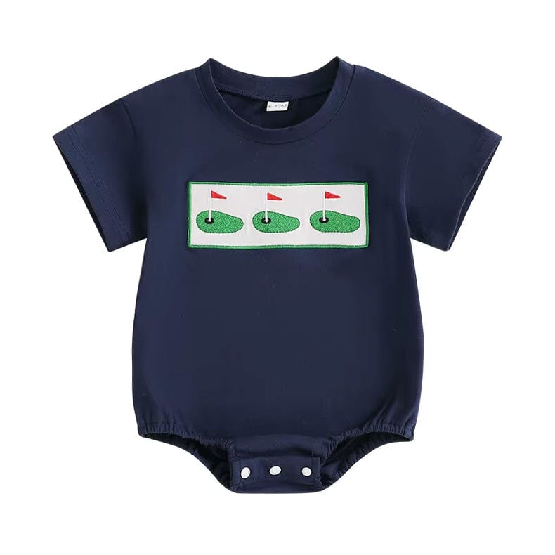 This baby boy romper is perfect for little ones who love a sporty and playful look. Designed in a deep navy blue, it features an embroidered golf course patch with flag details for a charming touch. Snap closures at the bottom provide easy diaper changes, making it both stylish and practical. Ideal for everyday wear, special outings, or as a cute gift for golf-loving families.