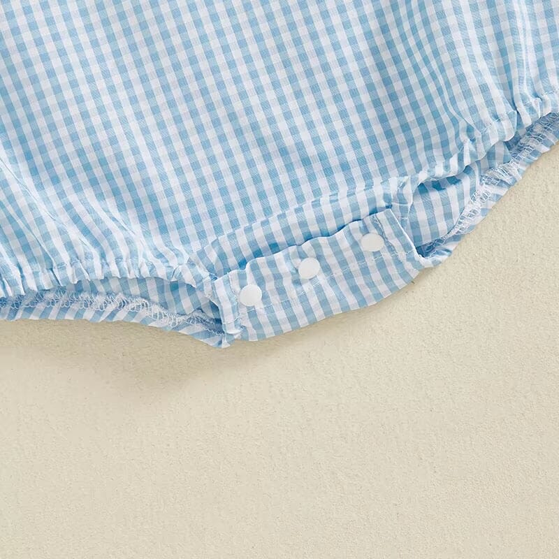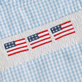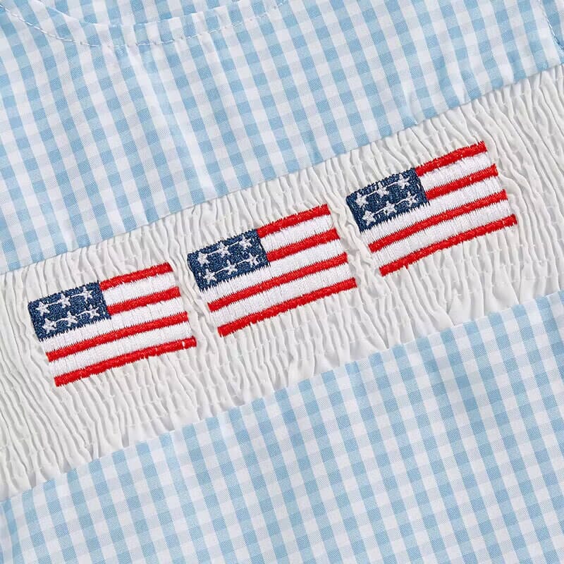 Celebrate Independence Day in style with this adorable baby girl romper, featuring charming smocked detailing and embroidered American flags. Designed with a classic gingham print in red or blue, it's the perfect outfit for your little star on the 4th of July. Convenient snap closures at the bottom make diaper changes quick and easy. Whether she's at a family barbecue or a fireworks show, this romper adds the perfect patriotic flair!