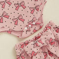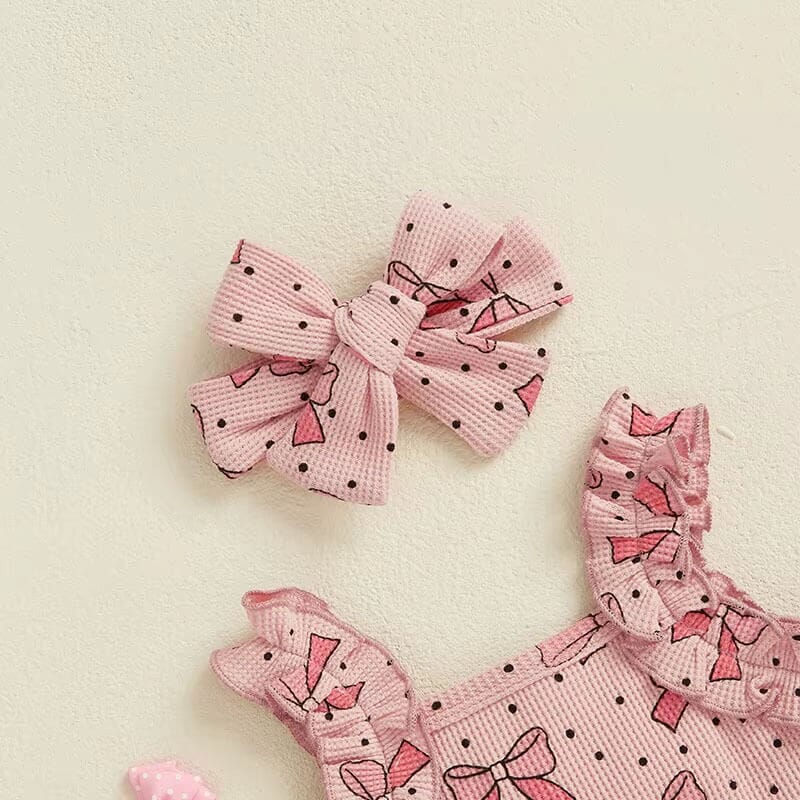 Dress your little one in this charming baby girl set, featuring a delightful bow and polka dot print. The ruffled sleeveless bodysuit adds a touch of sweetness, while the matching ruffle shorts provide comfort and style. A coordinating bow headband completes the look, making it an adorable outfit for photos, playdates, or outings. Cute and comfortable, this set is a must-have for your baby girl’s wardrobe!