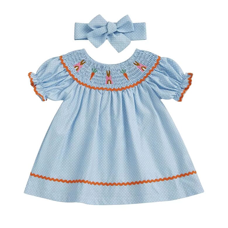 This adorable toddler girl dress is a charming choice for Easter celebrations. It features a classic smocked neckline adorned with sweet embroidered carrots, adding a festive touch. The lightweight fabric and puffed sleeves ensure comfort, making it perfect for all-day wear. Available in two lovely colors, soft red with delicate polka dots and a pastel blue with cheerful orange accents. Complete with a matching bow headband, this dress is a picture-perfect outfit for your little one’s holiday festivities.